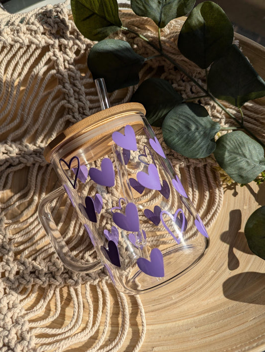 Hearts hearts Hearts 16oz Glass Can Cup with Bamboo Lid & Reusable Straw. Iced coffee cup. Cute cup. Vinyl cup. Pastel Heart. Love.