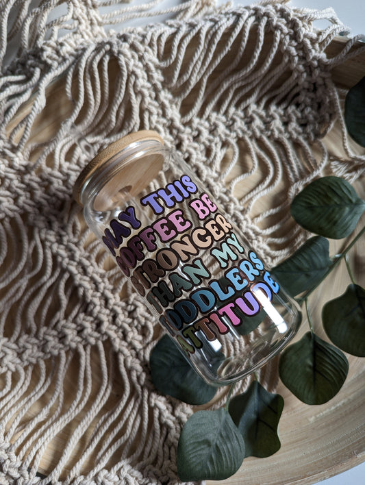 May this coffee be stronger than my toddlers attitude pastel rainbow 16oz glass cup or 17oz glass mug with bamboo lid & reusable straw