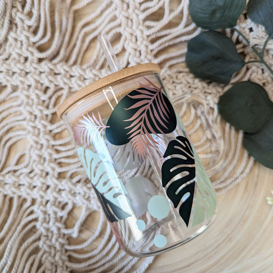 Rainforest 16oz glass can cup or 17oz glass mug with bamboo lid and reusable straw. Green and rose gold rainforest theme decal. coffee cup.
