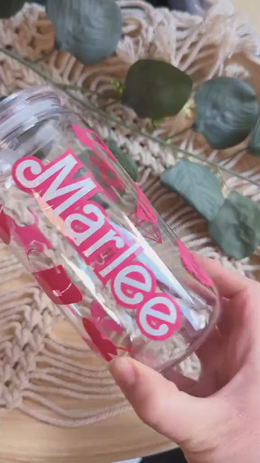 Personalised Barbie theme 16oz glass cup, 17oz glass mug with bamboo lid & reusable plastic straw or 16oz acrylic cup with clear acrylic lid